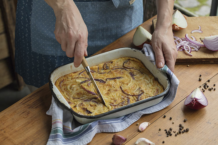 Disponer encima los gajos de cebolla salteados y llevar a horno bien fuerte hasta que la fainá esté seca y dorada. Retirar, dejar entibiar y servir.