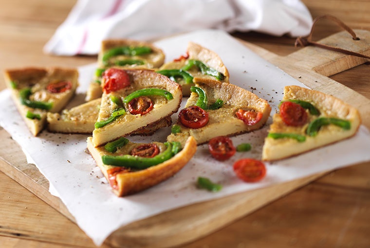 Volcar la mezcla sobre la pizzera reservada. Decorar con los vegetales y llevar a horno fuerte hasta que la fainá esté bien dorada. Retirar, dejar entibiar, desmoldar y servir.