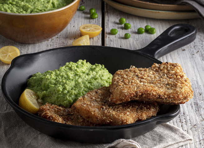 Freír en abundante Aceite Puro de Girasol Natura caliente hasta que estén dorados. Retirar, escurrir sobre papel absorbente de cocina, reservar calientes. Servir en una fuente acompañados del puré de arvejas.