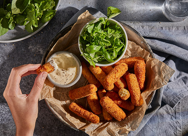 Pasado el tiempo de refrigeración, tomar pequeñas porciones, darles forma de fingers o bastoncitos, pasar por el huevo, el pan rallado y freír en abundante Aceite Puro de Girasol Natura caliente hasta dorar, retirar, disponer sobre papel absorbente de cocina y servir acompañados por el aderezo de mayonesa y yogur.