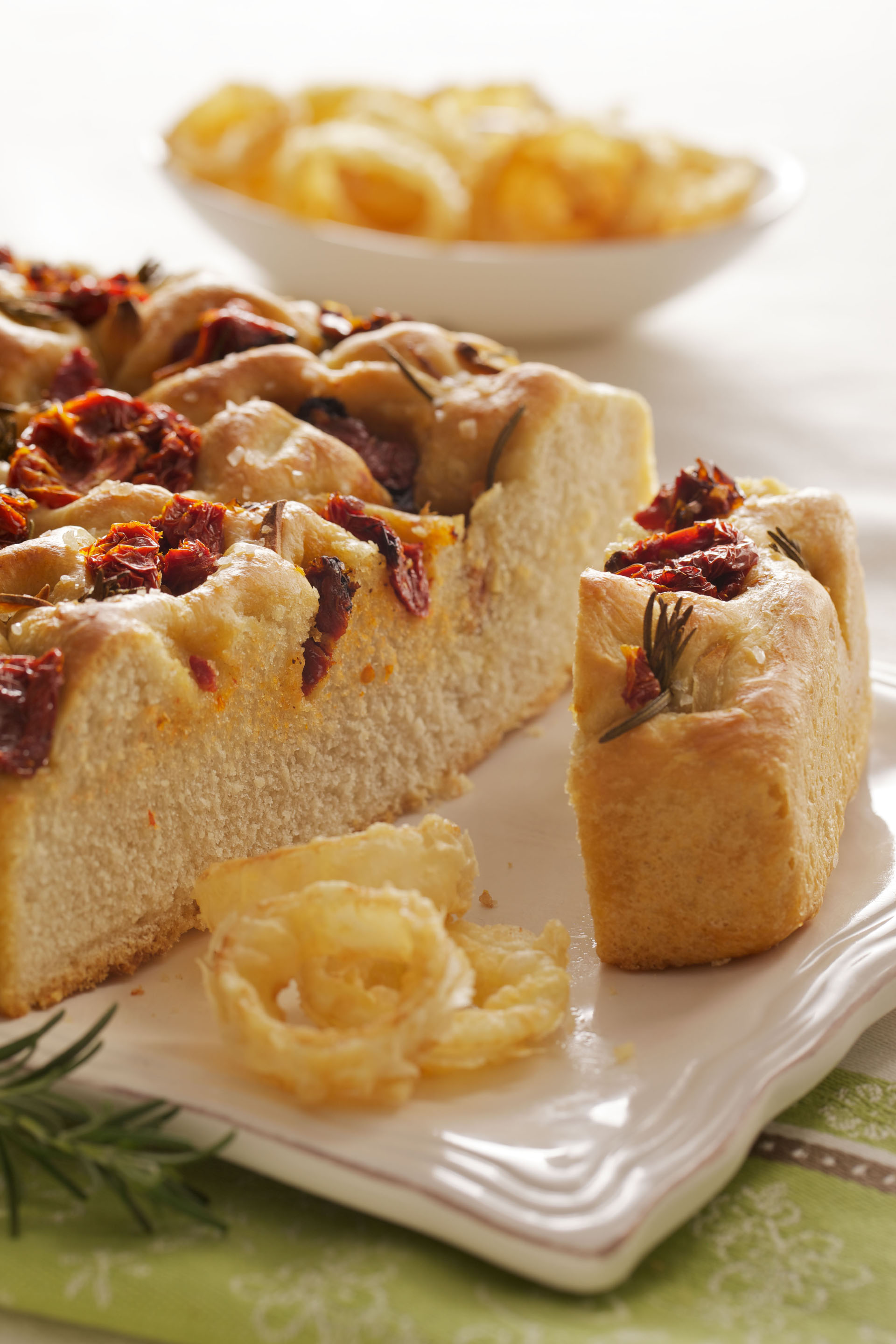 Focaccia al orégano con aros de cebolla fritos
