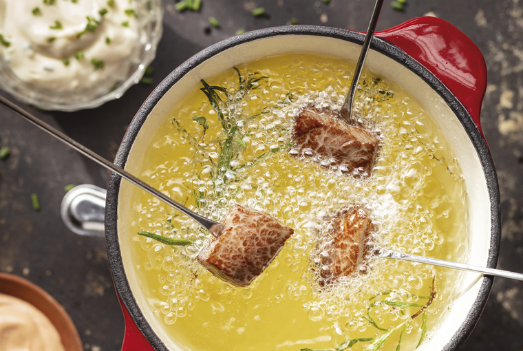 Una vez caliente transferirlo a la cacerolita para fondue prendiendo el mechero para conservar el calor. Cada comensal pincha un cubo de carne con el palillo de fondue y sumerge durante 1 minuto aproximadamente en el Aceite de Girasol Natura caliente aromatizado.