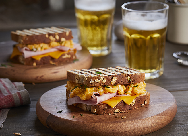 Tostar las rebanadas de pan, sobre una de ellas en caliente distribuir el queso cheddar, luego el jamón y por último los huevos revueltos.