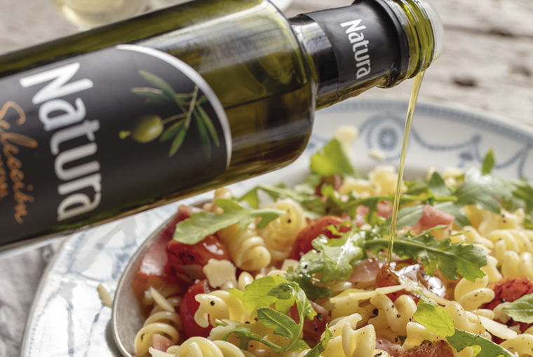 Cortar el jamón crudo en tiritas con una tijera de cocina, los tomates a la mitad previamente salteados con una cucharada de Aceite de Oliva Selección Natura y unir con los fusillis.