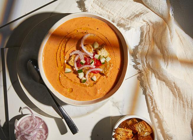 Retirar el gazpacho de la heladera, servirlo bien frío en cazuelas individuales, acompañado por los cubos de pan tostado, las verduras picadas y el huevo duro, servidos en cuencos aparte.