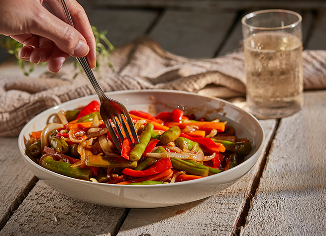 Aparte, en otra sartén, calentar el Aceite Puro de Girasol Natura, agregar la cebolla, el morrón y los vegetales blanqueados. Salar a gusto y mezclar integrando bien. Cocinar a fuego bajo durante 10 minutos e incorporar la salsa reservada. Continuar la cocción, mezclando cada tanto, durante otros 10 ó 15 minutos más, hasta que la salsa se reduzca un poco y los vegetales se cocinen.