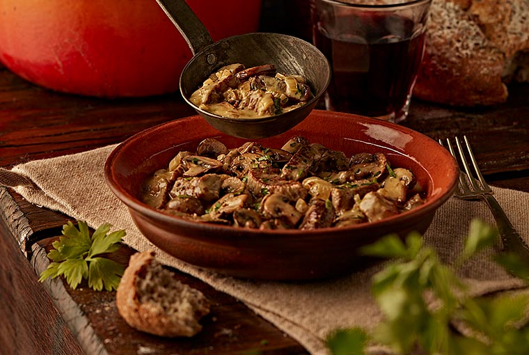 Añadir la crema, la Mostaza Natura, el caldo, una pizca de sal y pimienta. Cubrir la olla y dejar guisar a fuego lento durante unos 20 minutos aproximadamente.