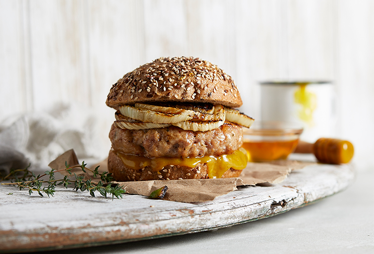 Para el armado de las hamburguesas, untar una de las tapas de los panes con la mezcla de Mostaza Natura y miel, disponer una hamburguesa, colocar por encima el hinojo grillado y cerrar el sándwich con el disco de pan restante. Repetir esta operación con cada hamburguesa.