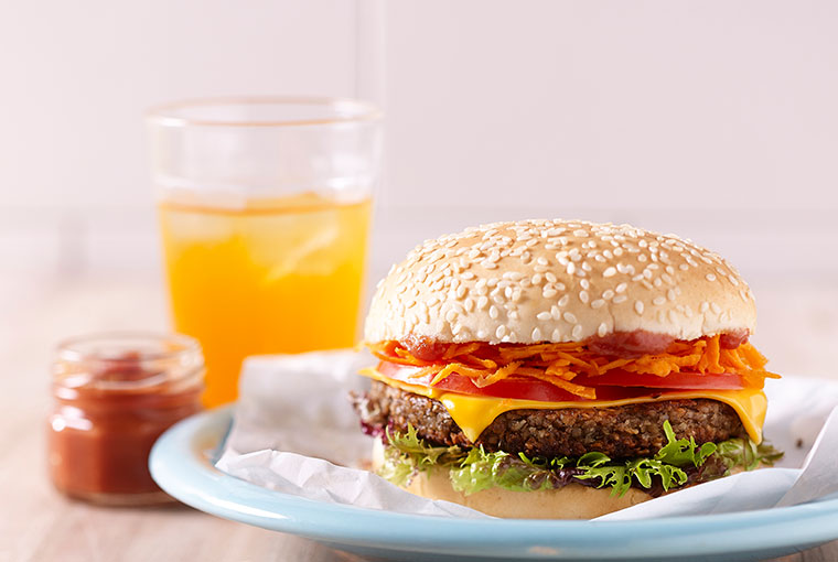 Para el armado de los sándwiches, abrir los panes, colocar sobre la base de cada uno una hamburguesa de lentejas y portobellos, encima disponer una feta del queso cheddar, un poco de la zanahoria rallada, unas rodajas de tomates y por ultimo una cucharada del Ketchup Natura. Tapar el sándwich y servir.
