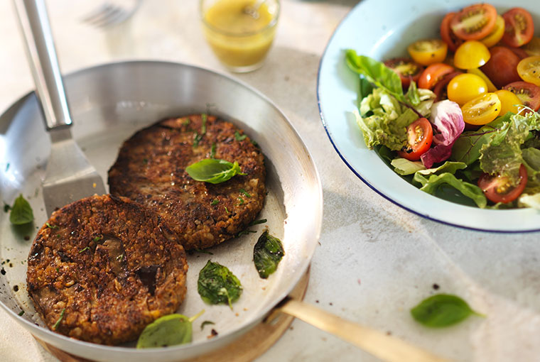 Dividir la mezcla en 4 partes iguales y dar forma a las hamburguesas. Cocinarlas en sartén caliente con un hilo de Aceite de Oliva Selección Natura durante 3-4 minutos por lado.