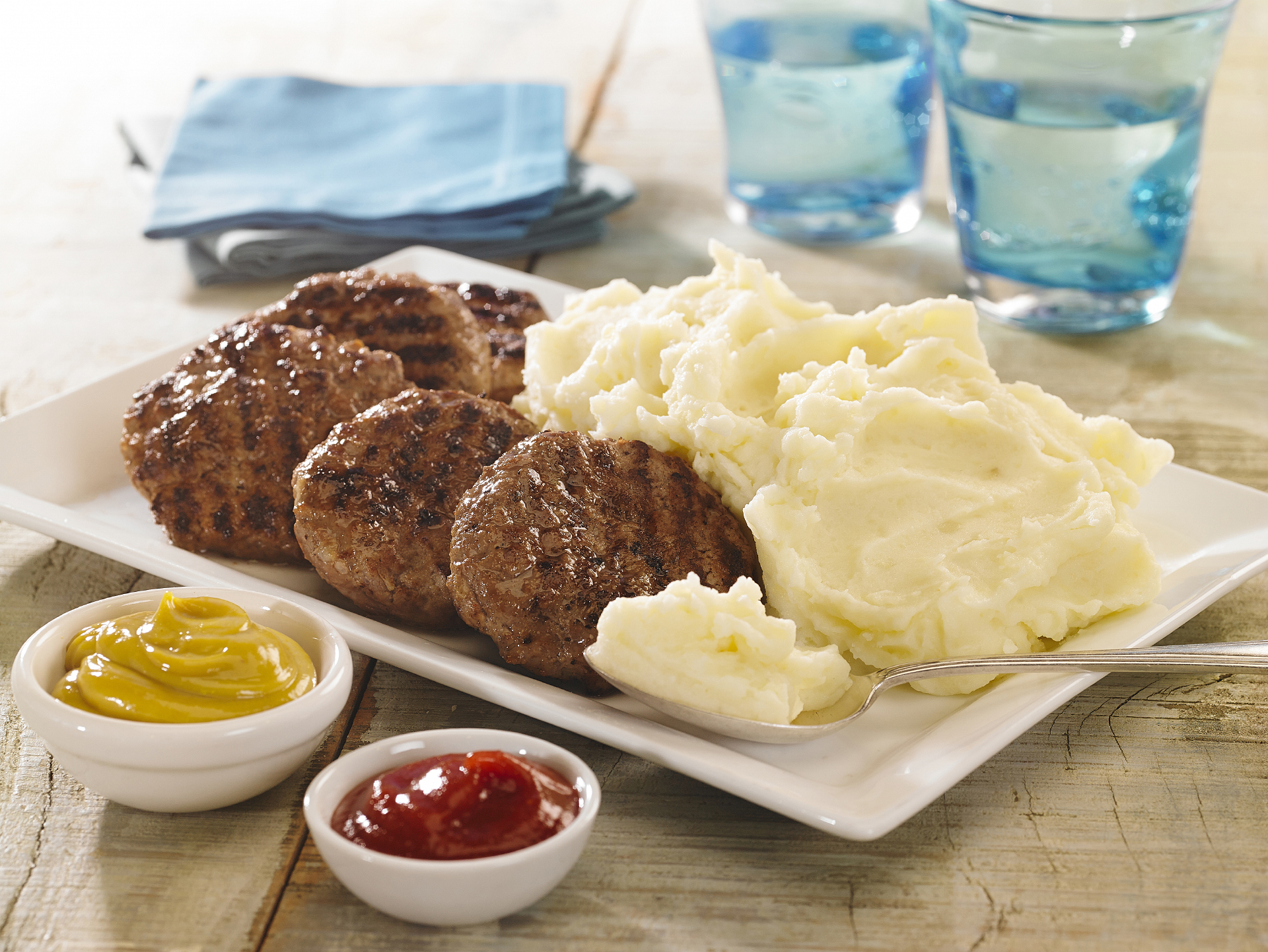 Una vez armadas, cocinarlas sobre una plancha caliente previamente lubricada con Rocío Vegetal Natura. Retirar y servir con aderezo de Ketchup Natura, acompañadas del puré realizado con las papas hervidas, pisadas y mezcladas con leche, Mayonesa Natura, sal y pimienta.