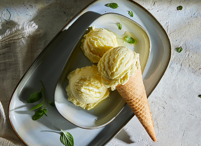 Servir el helado con un hilo de Aceite de Oliva Selección Natura y hojas de menta.