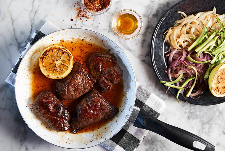 Retirar la película de los bifes y cortarlos en pequeños trozos. Calentar una sartén con un hilo de Aceite de Oliva Selección Natura, rehogar el hígado durante unos minutos. Añadir una pizca de sal y retirarlos del fondo de cocción. Reservar.