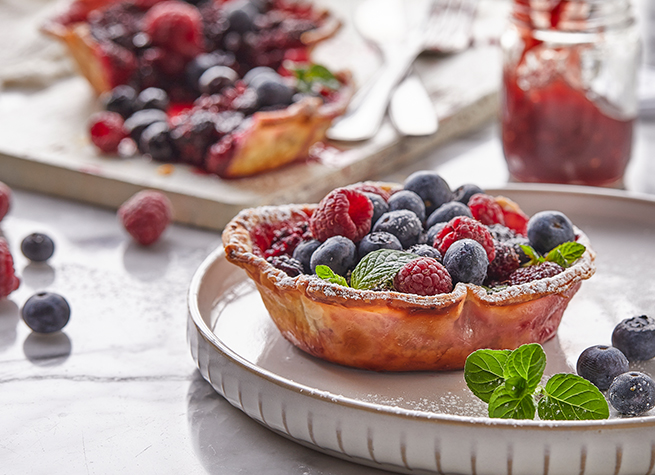 Cortar el disco de hojaldre y forrar los moldes, los recortes se pueden volver a amasar y reutilizar. Con ayuda de un tenedor pinchar las bases. Rellenarlas con la mermelada y decorar con los frutos rojos previamente pasados por azúcar. Pincelar los bordes de la masa con huevo y llevar a horno precalentado durante unos 20 minutos aproximadamente hasta dorar. Retirar, enfriar, desmoldar y servir con unas hojitas de menta.