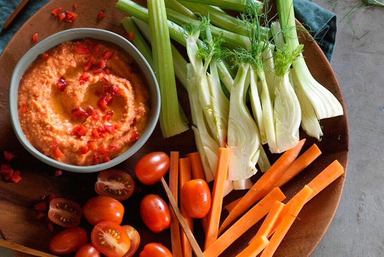 Disponer el hummus de pimientos en una cazuela, decorar con una espolvoreada de morrón fresco picado y el restante Aceite de Oliva Selección Natura.