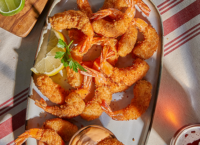 Pasar cada langostino por la mezcla de harina, luego por el pan rallado y presionar suavemente para que se adhiera bien.