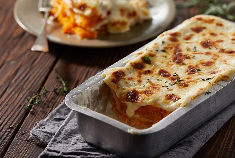 Lubricar una fuente para horno con abundante Rocío Vegetal Natura y disponer en modo alternado las láminas de lasaña, el puré de calabaza y la salsa blanca.