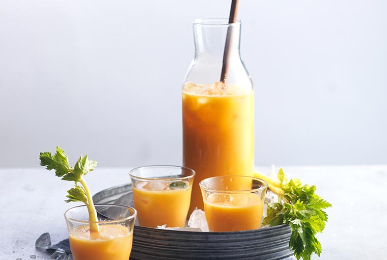 Pelar la zanahoria, la naranja y cortarlas en trozos pequeños, retirar las semillas de la naranja. Procesar junto con el resto de los ingredientes hasta obtener la consistencia de licuado. Por último, agregar el hielo picado y licuar nuevamente unos segundos para integrar. Servir en el momento.