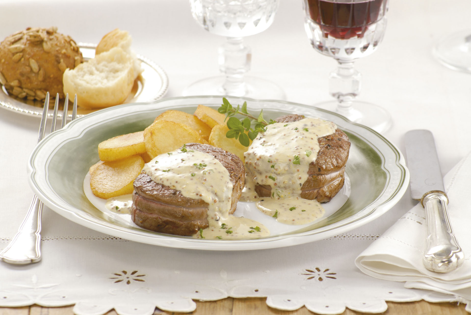 En la misma sartén incorporar la Mayonesa Natura, la mostaza, el caldo y las hierbas. Cocinar hasta que la salsa se reduzca y servir acompañado de papas españolas.