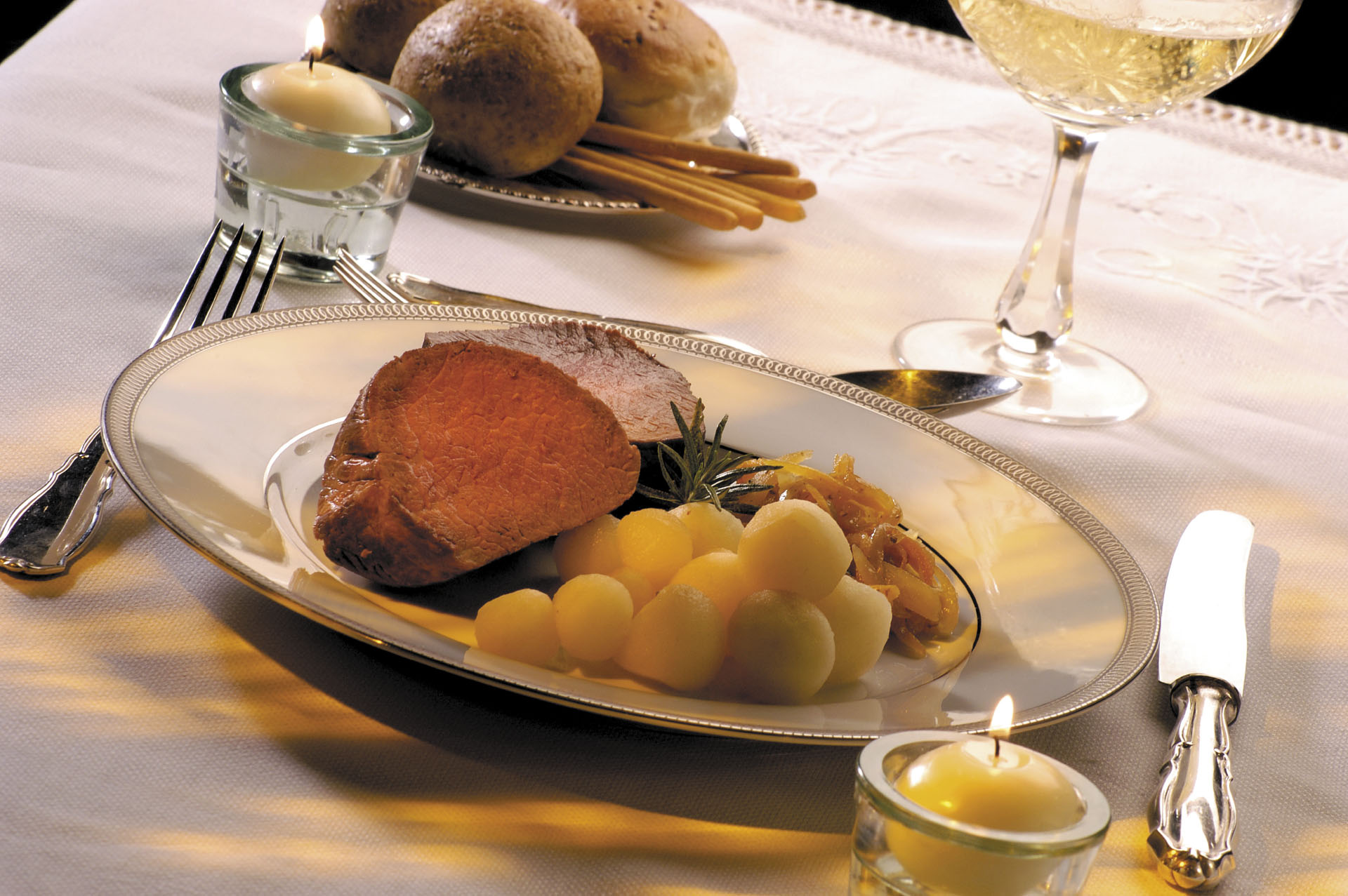 Servir la carne cortada en fetas con la salsa y decorada con hojas verdes de romero fresco y sobre estas las manzanas.