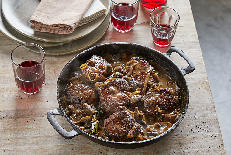 Agregar a la sartén del sellado el rulo de manteca restante, el ajo picado y la cebolla cortada en juliana, salar. Una vez que la cebolla haya cambiado de color agregar los champiñones y dejar dorar unos minutos. Luego, verter el vino blanco, dejar evaporar el alcohol y agregar el caldo de carne con el bouquet de hierbas que se retirará al finalizar la cocción. Incorporar la crema de leche y disponer los trozos de lomo reservados, llevar a hervor suave durante unos 8-10 minutos aproximadamente. Retirar y servir.
