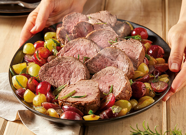 Servir el lomo rodeado de las uvas y salseado con el fondo de cocción.
