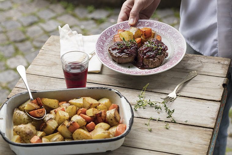 Una vez que la carne esté lista, servir los medallones de lomo con un poco de la salsa de vino tinto y acompañar con los vegetales al horno.