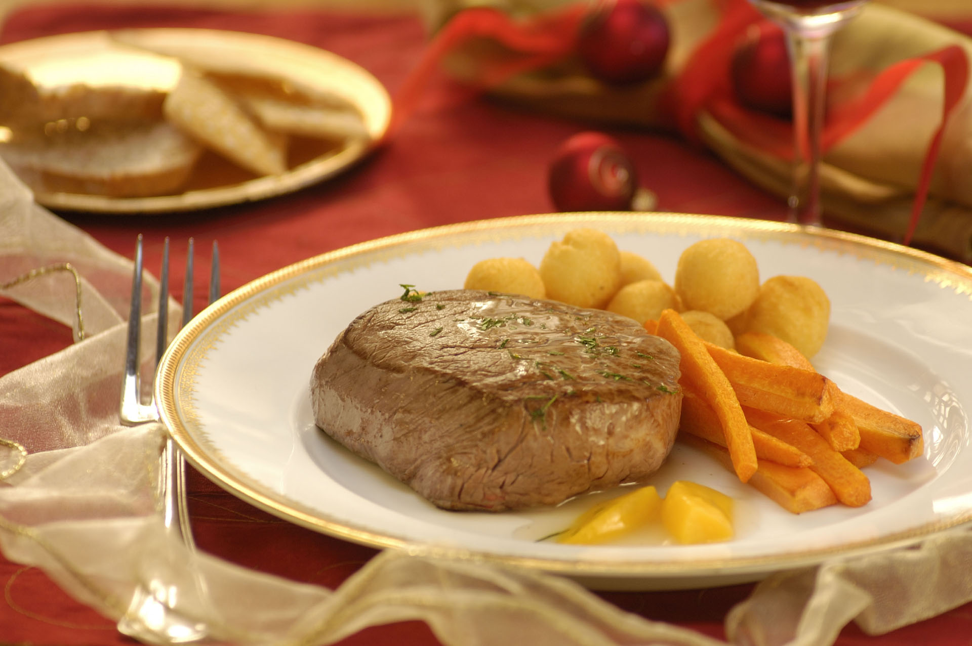 Lomo perfumado al chablis con guarnición de zanahorias y papas noisette