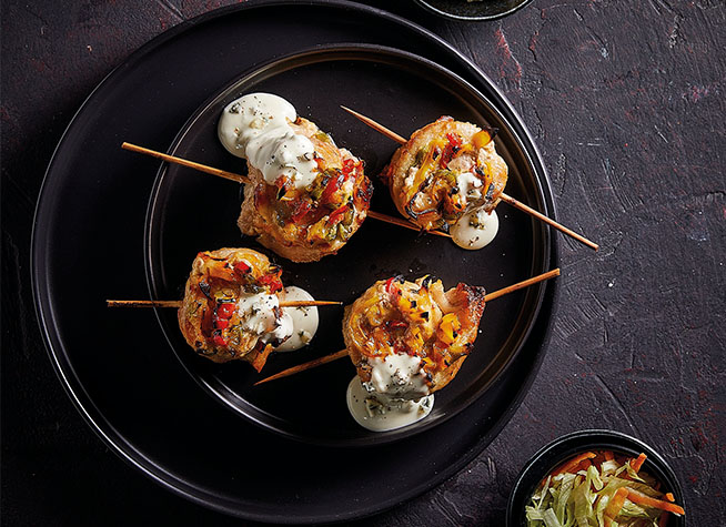 Disponer la lechuga y la zanahoria en una fuente, distribuir por encima los pinchos acompañados por el aderezo.