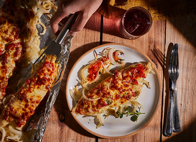 Retirar los filetes, distribuir por encima la salsa, agregar la mozzarella rallada, una pizca de orégano y llevar nuevamente al horno hasta que el queso se funda. Retirar y servir.