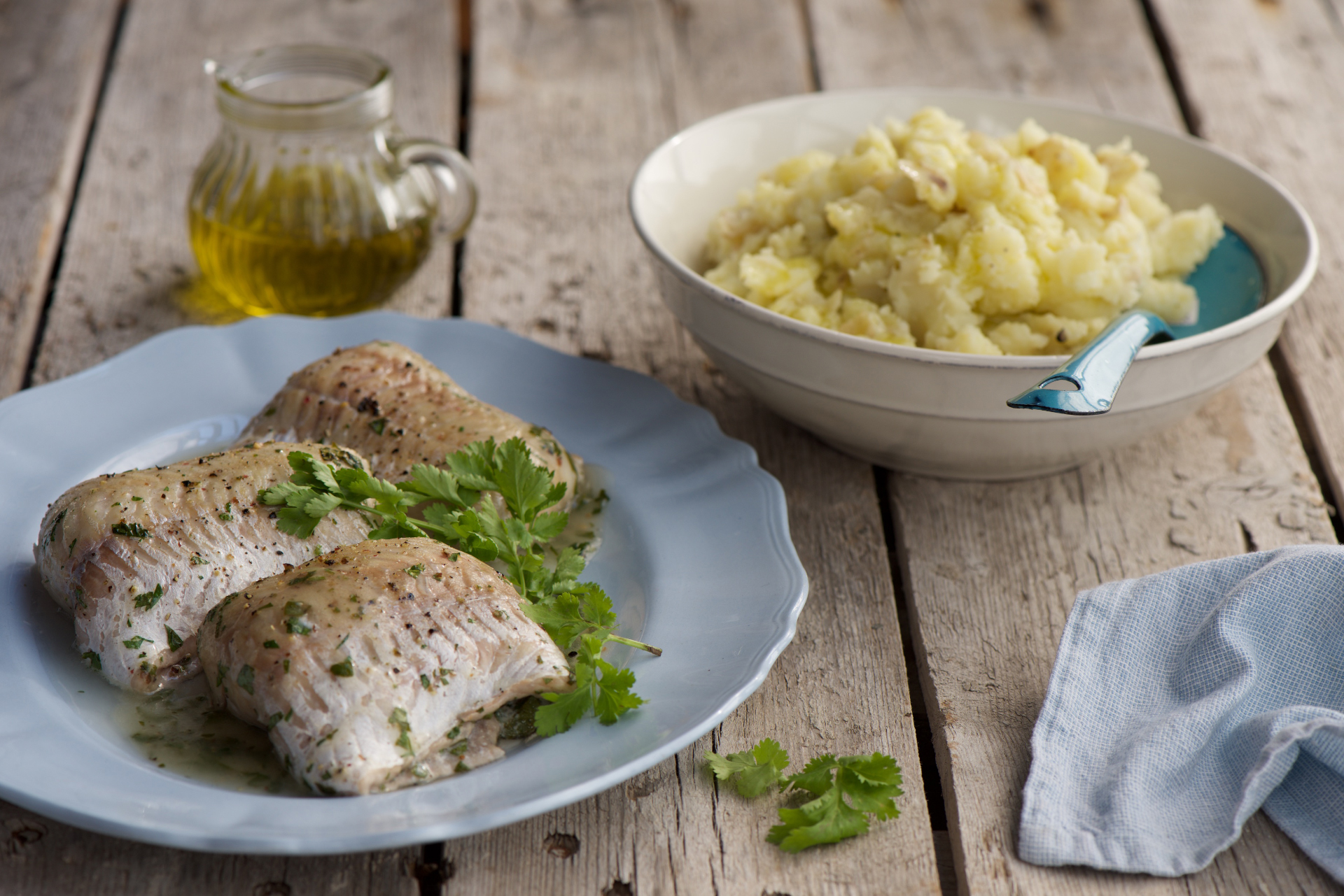 Colocar en cada plato unos filetes salseados con el jugo de cocción y acompañar de unas cucharadas del puré rústico.