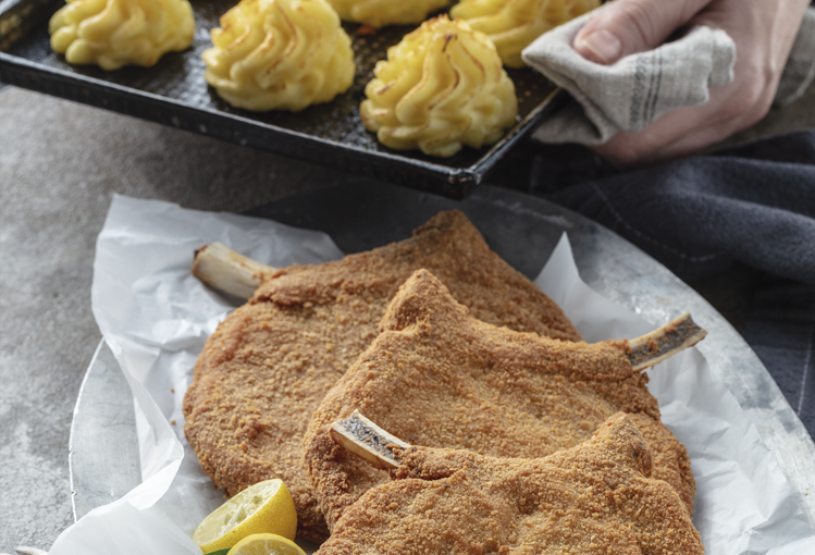 En un bowl batir los huevos sin sal, sumergir las costillitas y luego empanar. Freír en abundante Aceite de Girasol Natura caliente, retirar y disponer sobre papel absorbente de cocina, salar y servir acompañadas de los copitos de puré.