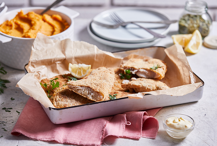 Milanesa de pescado con puré de calabaza