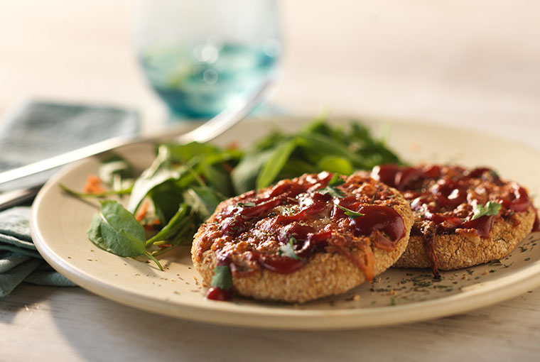 Lubricar ambos lados de las milanesitas con abundante Rocío Vegetal Oliva Natura y acomodarlas sobre una placa para horno. Llevarlas a horno fuerte hasta dorar de ambos lados, retirar, distribuir sobre cada milanesa una cucharada de Ketchup Natura y un puñado de queso en hebras, llevar nuevamente al horno hasta gratinar y retirar.
