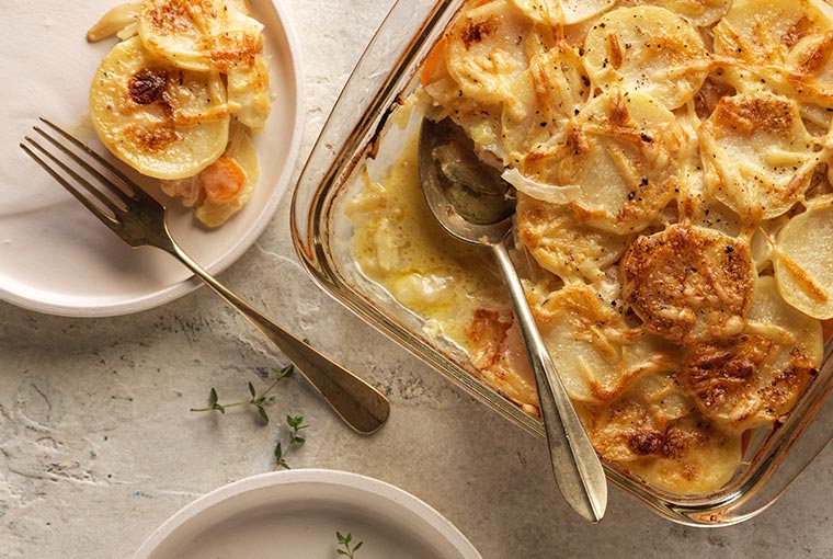 En una fuente lubricada previamente con Rocío Vegetal Natura, colocar las papas en capas entre sí e intercalándolas con la cebolla. Agregar la crema de leche y el queso reggianito por encima.