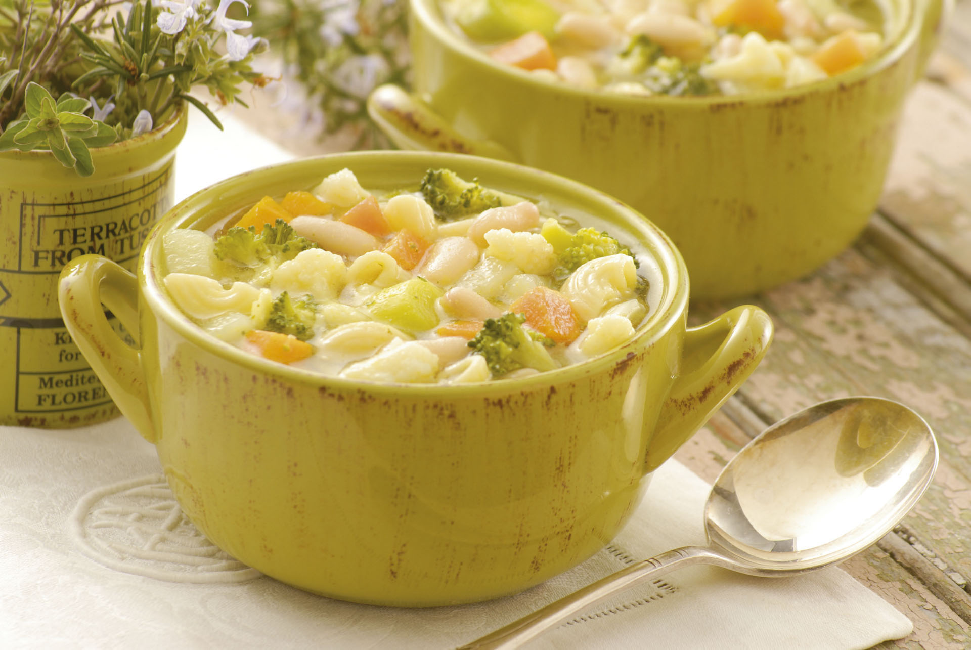 Hervir los porotos durante 10 minutos en el caldo de verduras. Incorporar las zanahorias, el brócoli, la coliflor, y las papas. Continuar la cocción durante 20 minutos, manteniendo el hervor de la preparación.