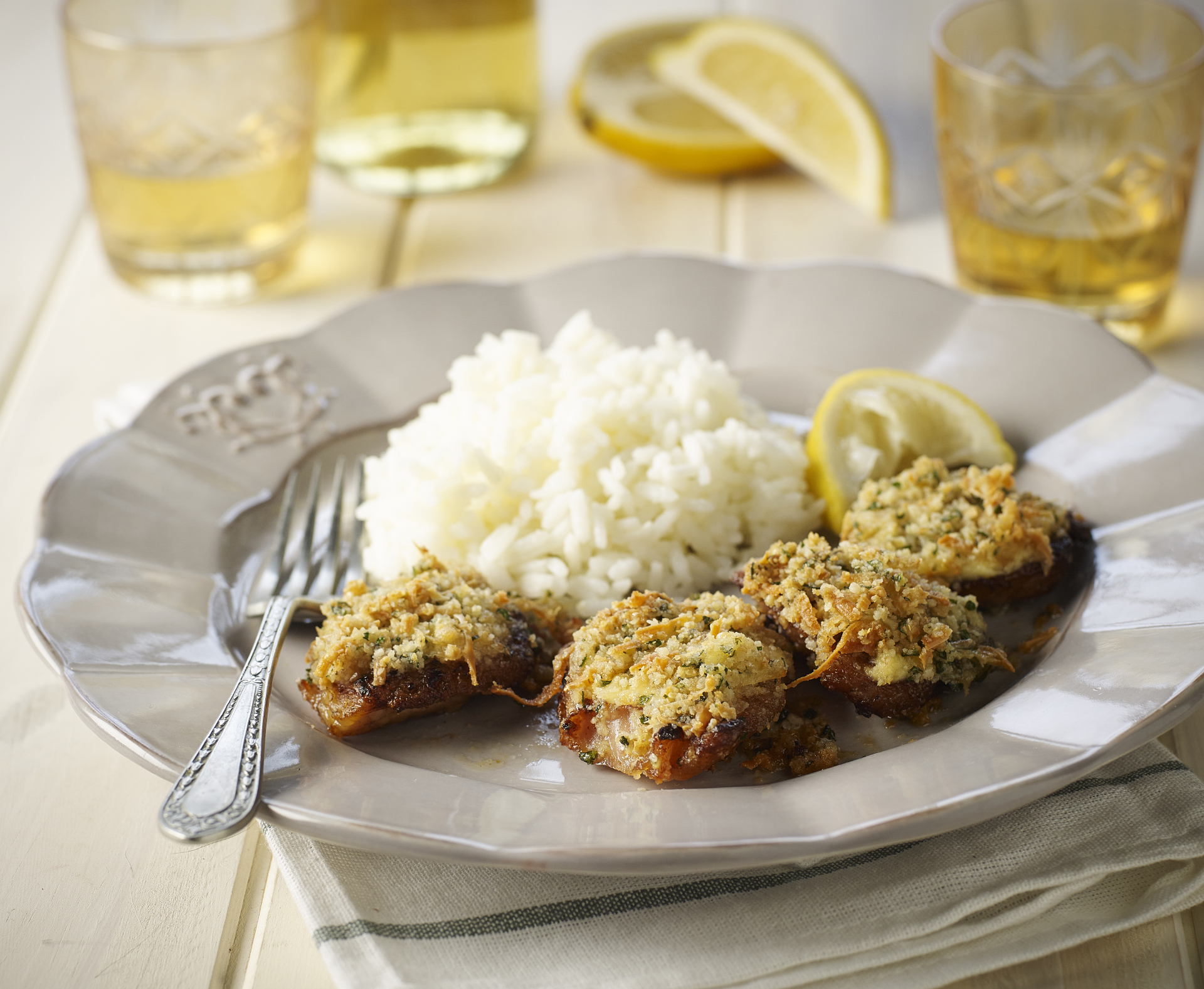 Mollejas crocantes con arroz blanco saborizado al ajo