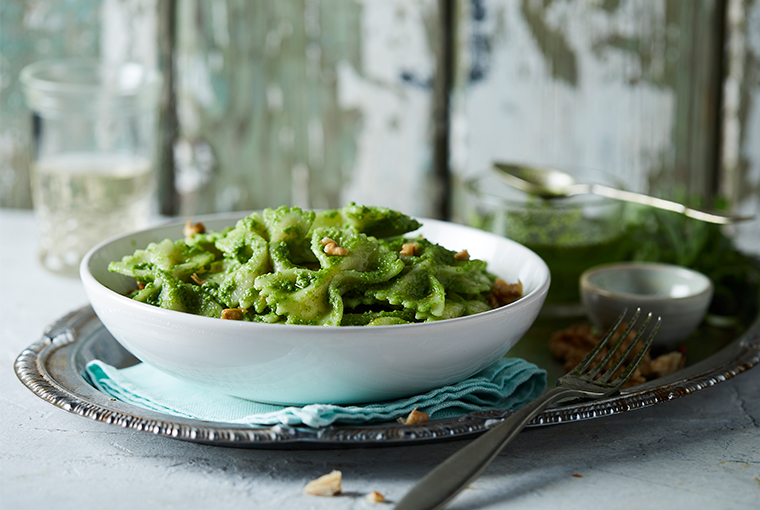 Disponer el pesto de rúcula sobre una sartén sin fuego. Colar los fideos escurridos y unir al pesto de rúcula. Llevar a fuego bajo, amalgamar bien. Retirar y servir calientes decorados con algunos piñones o nueces en trozos.