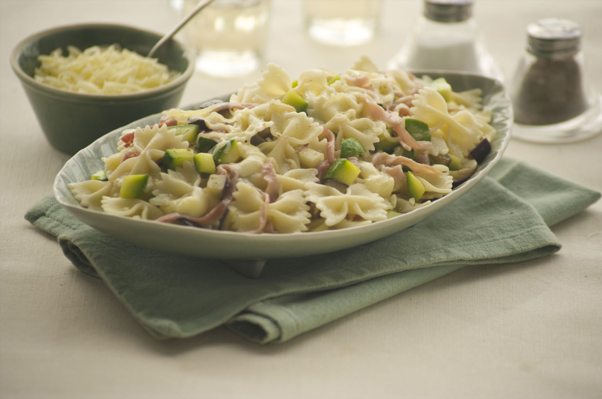 Hervir la pasta en abundante agua con sal. Cuando estén al dente retirar del fuego, colar y reservar en una fuente rociada con la mitad del aceite de oliva Natura. Cortar el jamón en tiras finas y dorarlo en una sartén con el resto del Aceite Oliva Virgen Extra Natura, agregar los zucchini y la berenjena cortadas en cubos.