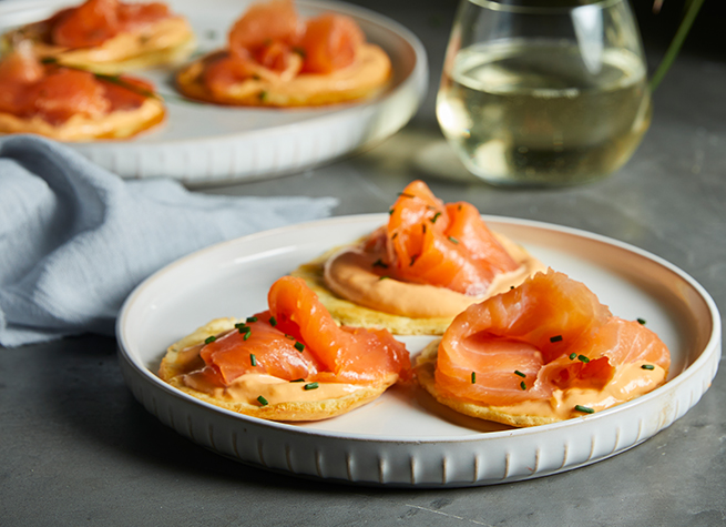 Para el armado de los montaditos, distribuir una cucharada de Salsa Golf Natura sobre cada disco, disponer las fetas de salmón ahumado y espolvorear con el ciboulette picado. Servir.