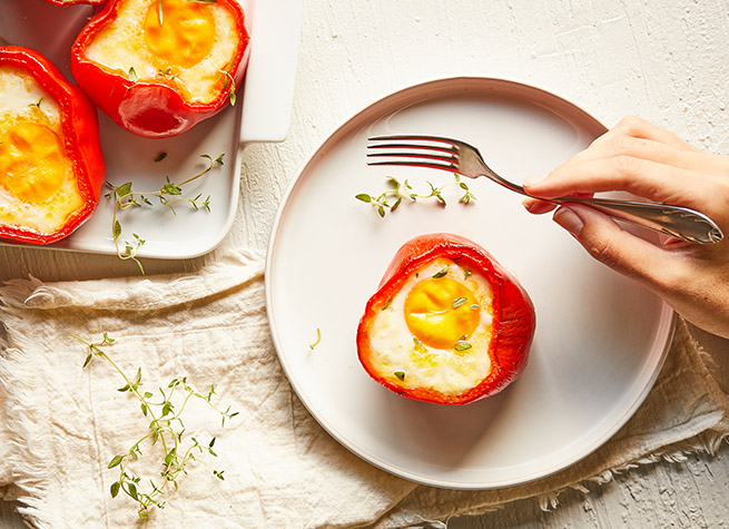 Luego, retirar y rellenar con la mozzarella rallada y las hierbas aromáticas picadas. Cascar un huevo sobre cada pimiento y llevar nuevamente al horno hasta que la mozzarella se haya fundido y el huevo cocinado. Retirar, salpimentar a gusto y servir.