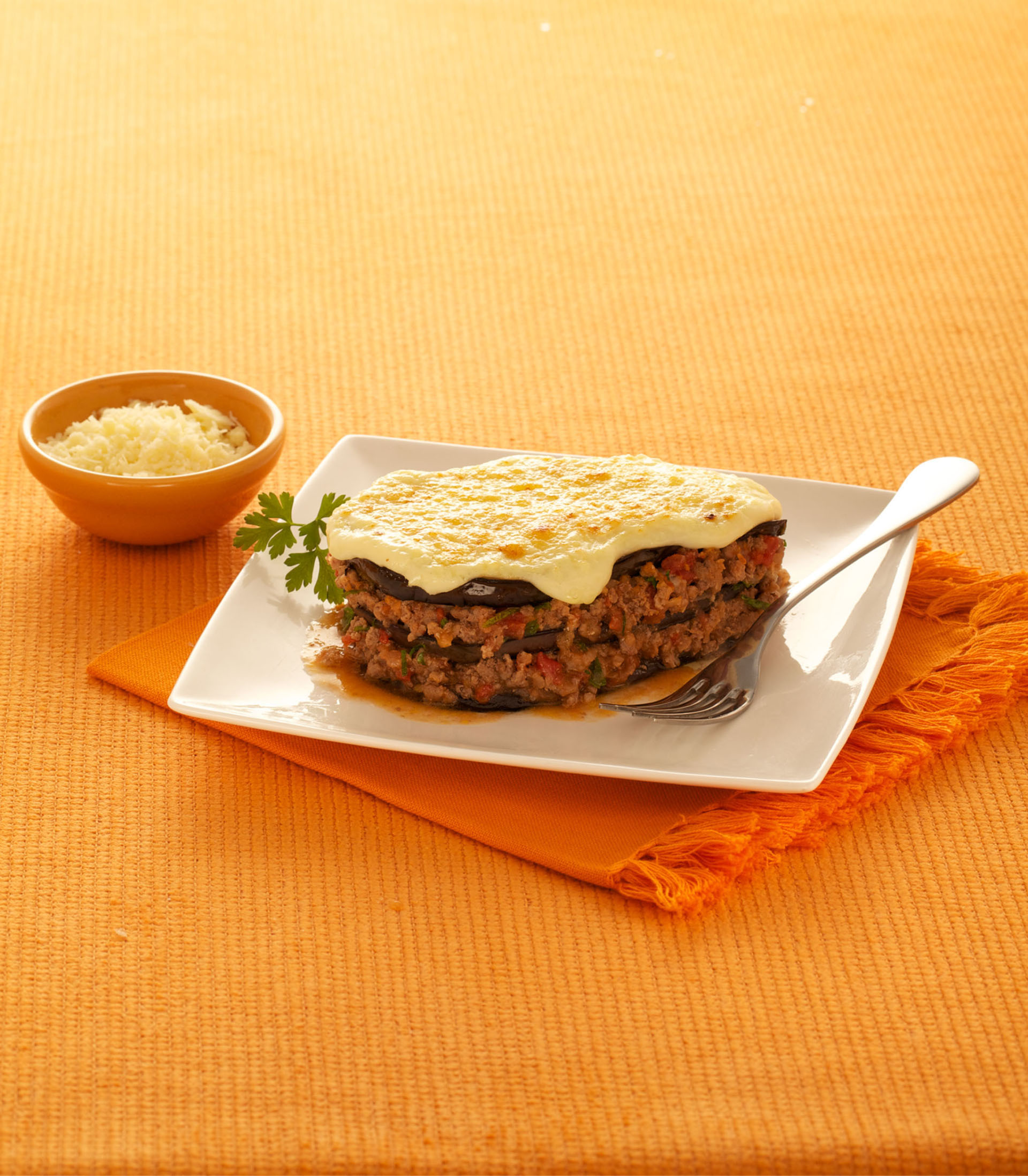 En una fuente o en cazuelas individuales, disponer una base de berenjenas, una capa de carne y continuar hasta completar. Cubrir con la salsa blanca y llevar a horno fuerte hasta que se gratine la cubierta. Retirar y servir caliente.