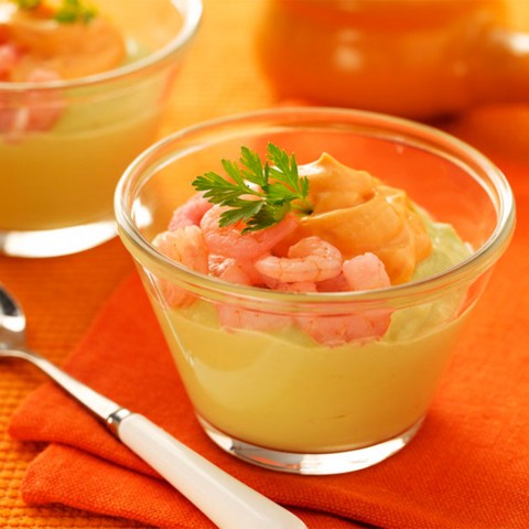 Servir la mousse en copas individuales acompañado de camarones rociados con limón y perejil picado.