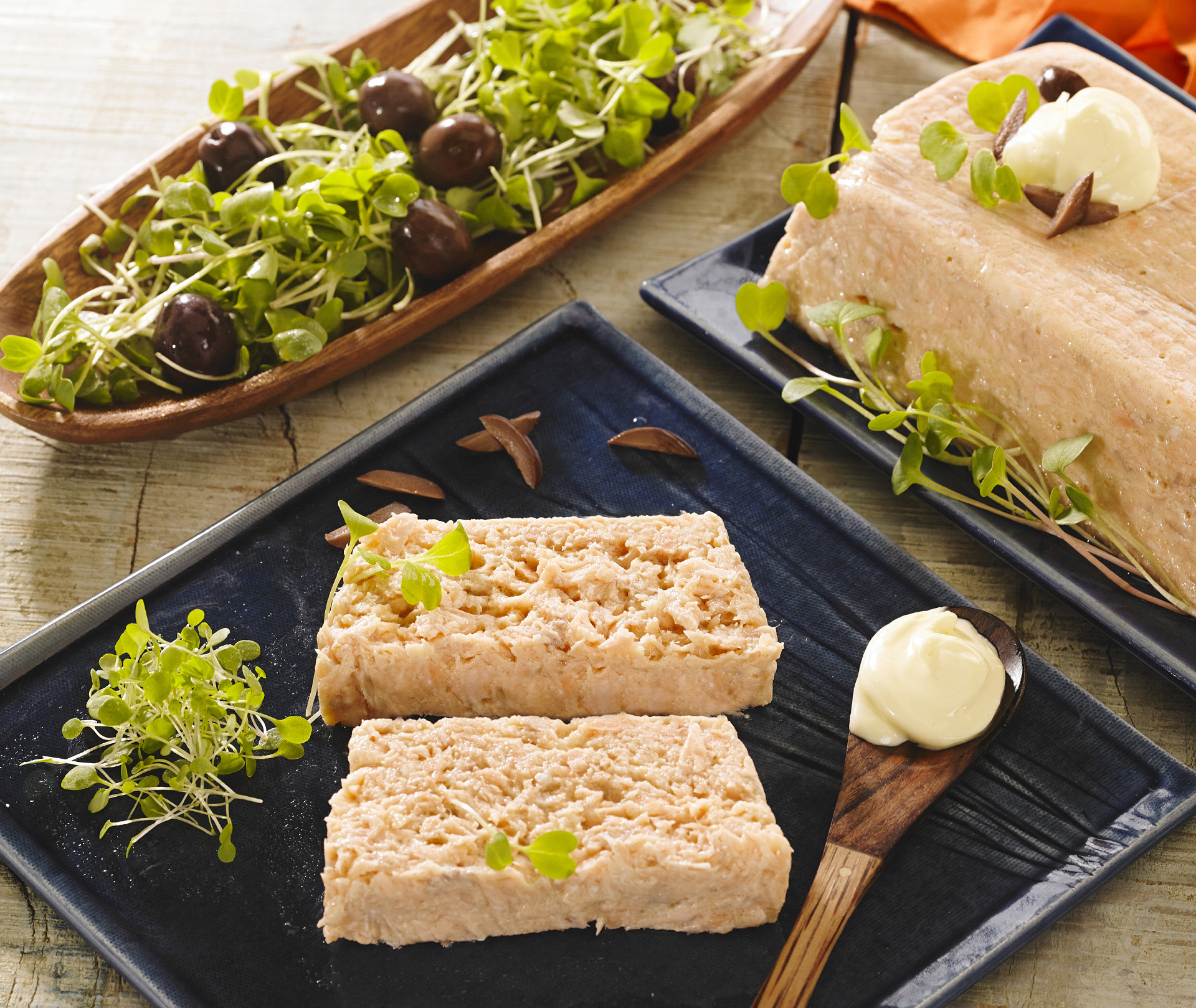Para la presentación, desmoldar y cubrir con una mezcla de Mayonesa Natura y crema batida, y decorar con las aceitunas negras.