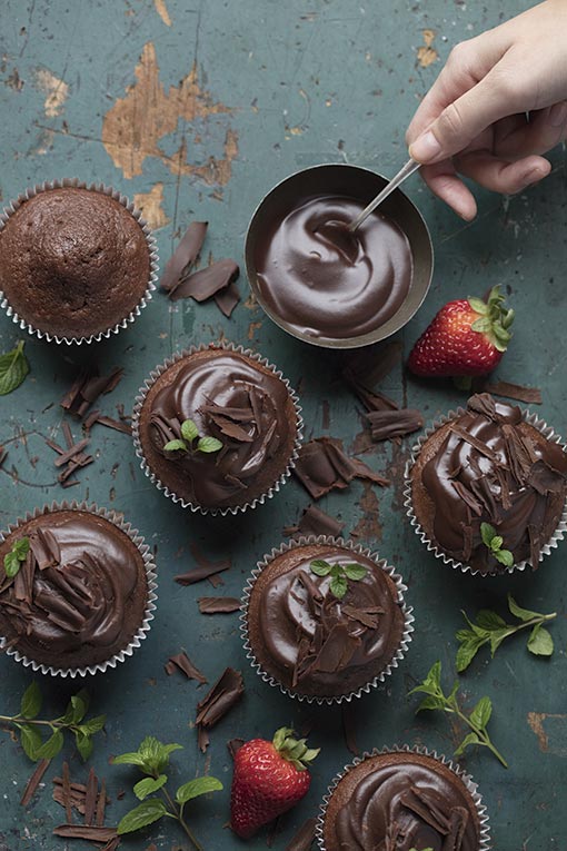 Para decorar, fundir el chocolate picado con la crema a baño de María. Añadir la manteca blanda, integrar y una vez que tome consistencia un poco mas firme, decorar los muffins.