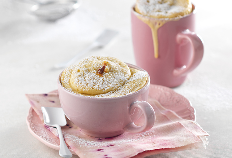 En una taza apta para microondas disponer la harina, el azúcar, el Aceite Puro de Girasol Natura, la leche, el huevo y la esencia de vainilla. Integrar bien hasta obtener una mezcla homogénea. Hundir en el centro de la mezcla la cucharada de dulce de leche y cocinar durante dos minutos y medio en microondas a máxima potencia (**). Retirar, dejar entibiar, espolvorear con el azúcar impalpable y las granas a gusto. Servir en la taza.