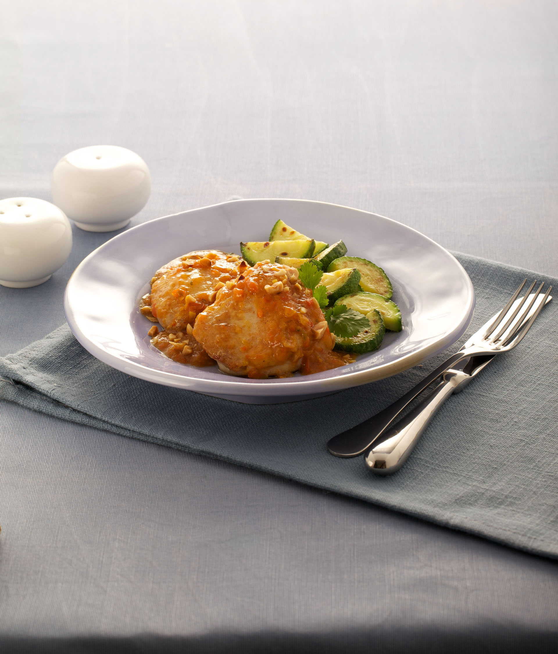 Salpimentar a gusto y distribuir por encima del pollo los maníes picados. Servir la preparación inmediatamente acompañada con zucchinis cortados en rodajas salteados previamente en una sartén con Aceite de Oliva Natura.