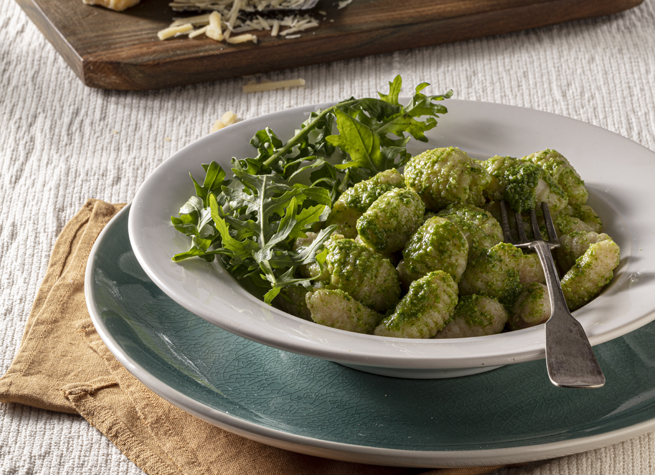Ñoquis de sémola al pesto de rúcula