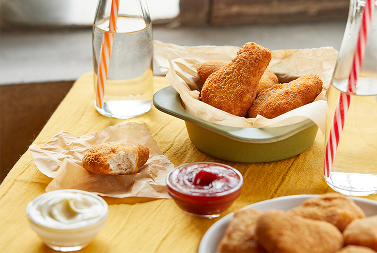 Con las manos húmedas formar bolitas, pasarlas por la harina, el huevo y el pan rallado, aplastarlas ligeramente y, con el dedo índice y mayor, achatar uno de los extremos dando forma a las clásicas nuggets, repetir esta operación hasta terminar la mezcla.