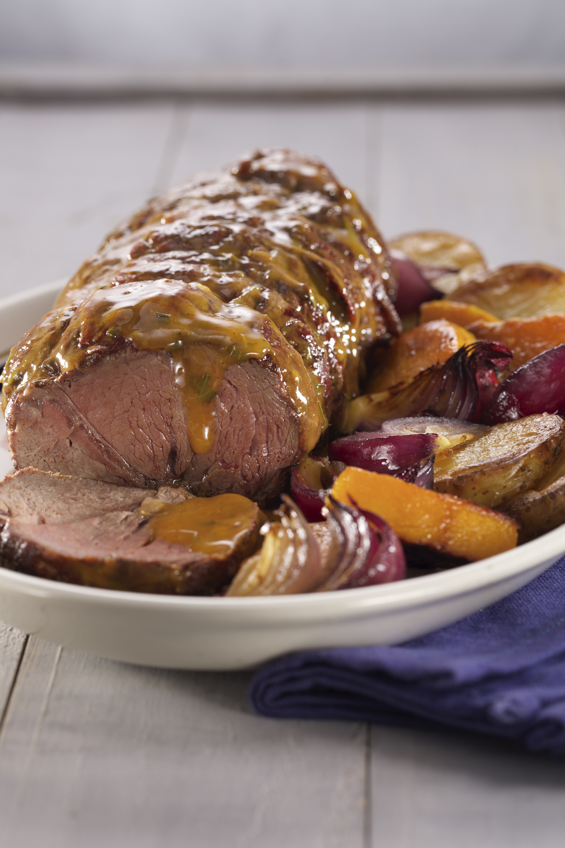Saltear la carne en una sartén caliente con el Aceite de Oliva Natura, dar vuelta de ambos lados hasta que quede sellada. Retirar del fuego y disponerla en una fuente para horno. Untarla con el aderezo. Cocinar en horno fuerte de 35 a 40 minutos. Cada 15 minutos retirar la carne del horno y pintar con el aderezo. Una vez a punto retirar y reservar al calor. Colocar el jugo de la carne en una cacerolita y añadirle la fécula desleída con el caldo. Llevar a fuego mínimo hasta que espese. Bañar con esta salsa la carne.